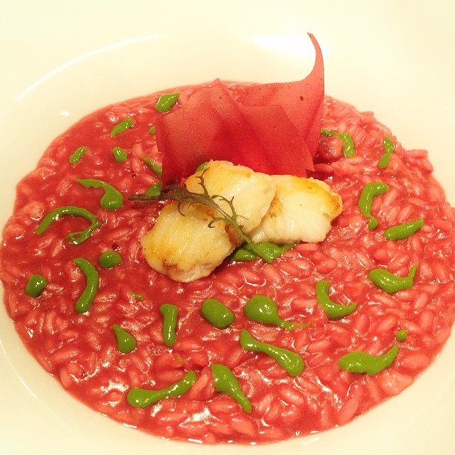 Davvero un gran bel piatto questo! Partendo dall’idea del Risotto alla Milanese, Matteo Tonin, secondo chef del ristorante, ha sostituito al giallo dello zafferano il rosso della rapa, all’ossobuco di vitello quello di pescatrice e alla classica gremolada con la quale solitamente si accompagna il famoso piatto meneghino, una salsa al prezzemolo ed altre erbe aromatiche. “Cucino la rana pescatrice prima a bassa temperatura e poi la scotto sulla plancia. Il risotto è un Carnaroli. A completare il tutto … solo una cialda ancora di rapa rossa a dare croccantezza”.